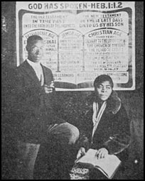 G.P. Bowser standing before one of his preaching charts and his wife Francis (Fannie) Rebecca, holding the Bible.