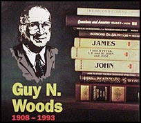 Guy Napoleon Woods was born September 26, 1908 in Vardeman Mississippi. At about the age of five months his parents moved to Holladay, Tennessee where he attended the public schools. He was baptized into Christ on August 24, 1926, in the Sycamore creek near Holladay by brother J. W. Grant. He preached his first sermon on September 26, 1926, which was on his eighteenth birthday, one month and two days following his obedience to the Gospel. A few weeks later he enrolled in Freed-Hardeman College, commuting to Memphis on the weekends preaching for the South Parkway congregation. He did local work in Thompkinsville, Kentucky; Post, Wellington and Lubbock Texas. Then for many years he worked as an evangelist, traveling many thousands of miles, holding some fifty meetings each year while being booked ahead for over two hundred more. He was a great defender of the Truth, preaching more sermons and holding more debates than any other preacher of the Gospel in his time. He became one of the best qualified religious lecturers in the nation. He was a Bible Scholar of national recognition and has authored many religious books including commentaries on the Books of John, Peter, James and Jude, "The Second Coming of Christ," "Will We Know Each Other In Heaven," "Biblical Background of the Troubled Middle East,"